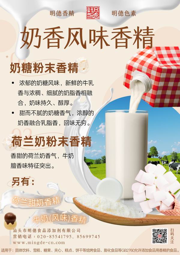 此外,汕頭市明德食品添加劑有限公司在數十年的研發中還推出了許多奶香風味香精。歡迎廠家們了解嘗試~
